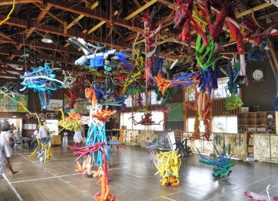 カラフルに塗られた流木やドングリなどの木の実でつくられたオブジェが、体育館の天井から吊り下げられて動いていました。